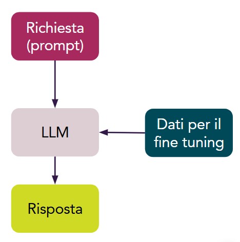 Il fine tuning consiste nell’addestrare ulteriormente il LLM su un set di dati specifico, incorporando direttamente le informazioni all’interno del modello.